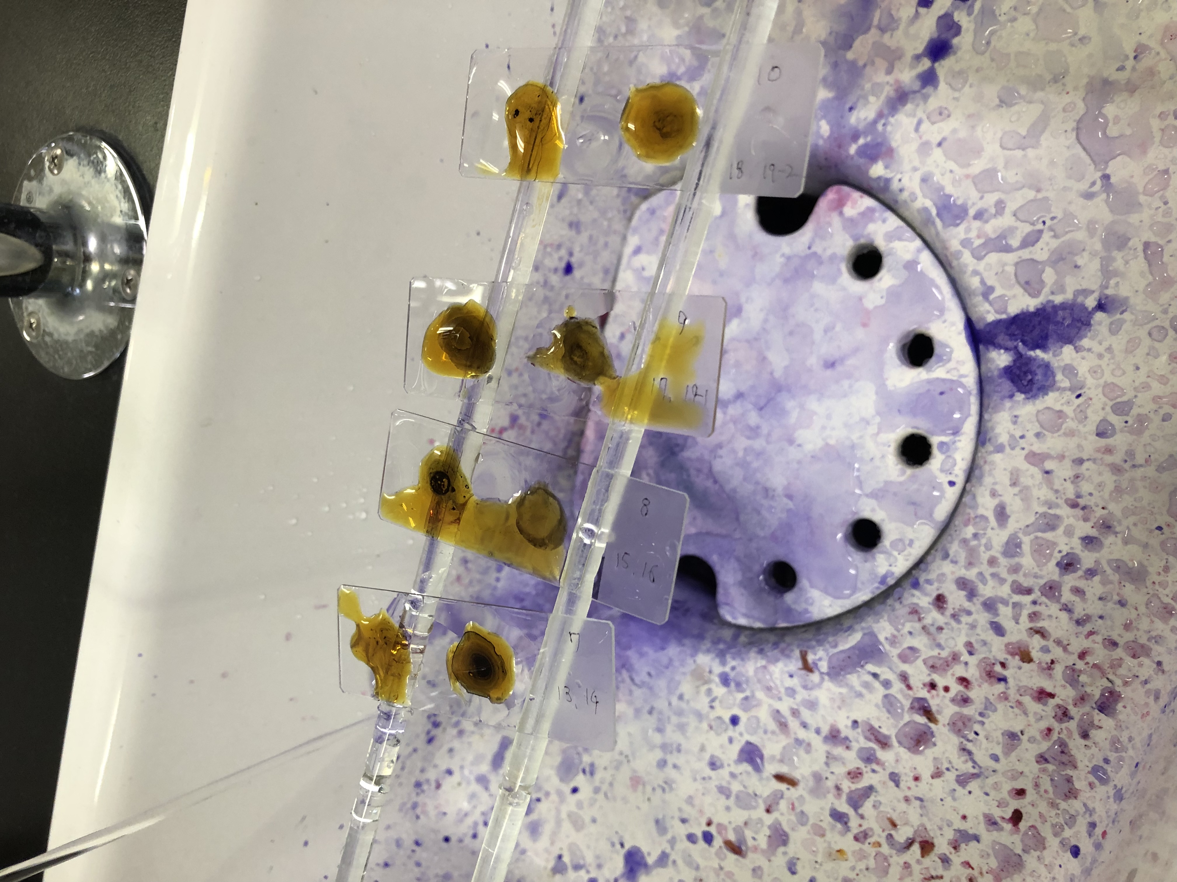 飛び散ってる青がクリスタルバイオレットって言う厨二感満載の液で、赤いのがフクシン。