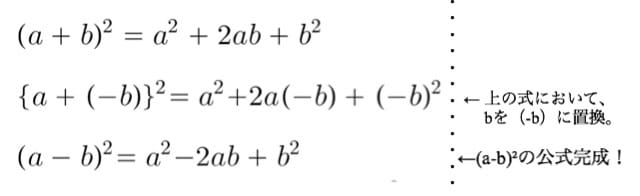 この様に -b を +(-b)と捉える事でマイナスのバージョンの公式はプラスの方の公式から作る事が出来ます。