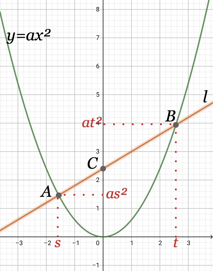 \begin{eqnarray}&&また、直線lの式は切片をbとして、\\[5mm]&&y=a(s+t)x+b と表せる。\\[5mm]&&lは点A(s,as^2)を通るので、\\[5mm]&&as^2=a(s+t)\times s+b\\[5mm]&&したがってb=-ast\end{eqnarray}